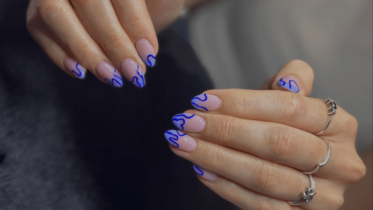 This look keeps it playful with a twist on the classic French. The base is Rubber Base Cover Frosted Pink, topped with a soft French in 217 Wonderful Blue. To finish it off, cobalt lines in 373 Royal Blue add that fun, wavy detail.