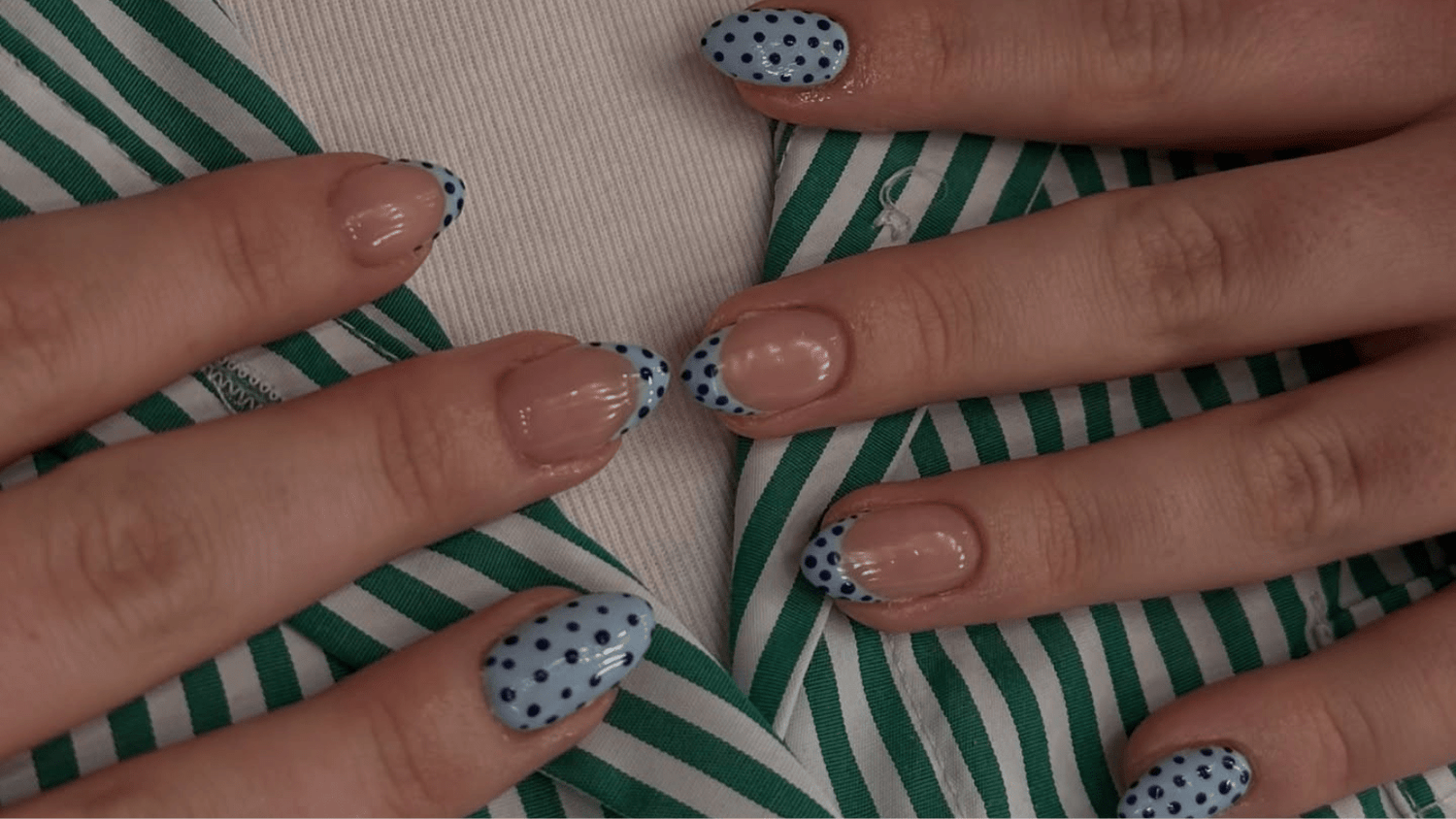 Polka dots are having a moment – and this fresh take in blue proves exactly why the trend deserves a spot in your nail rotation. The look combines a soft Rubber Base Cover Rose Beige with dotted French tips in 300 Light Blue, finished with spots in 263 Indigo Blue. It's playful but polished, and adds just the right amount of detail without overdoing it.