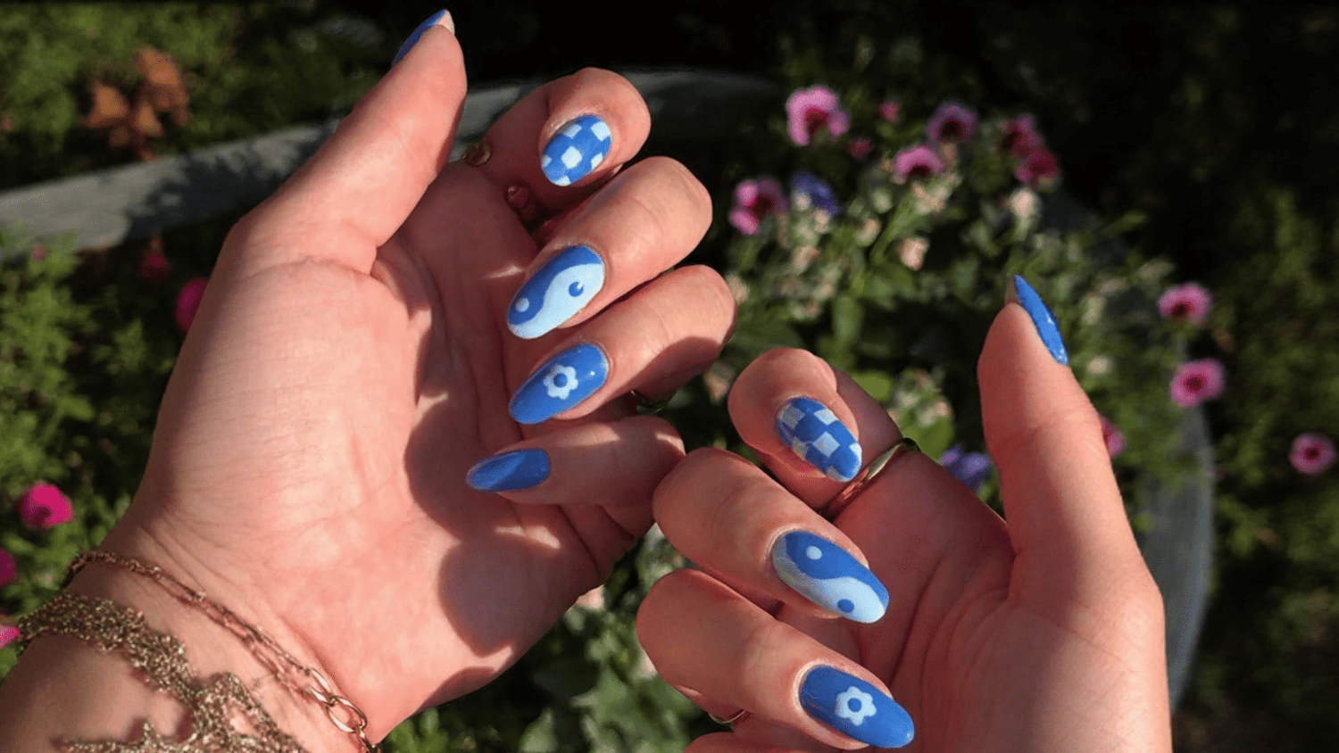 Why settle for one design when you can have them all? This look combines checkerboard, yin-yang and floral details in 301 Azure Blue and 266 Baby Blue – a playful mix that feels fun but still put together. Perfect if you love switching it up and want your nails to stand out from every angle.
