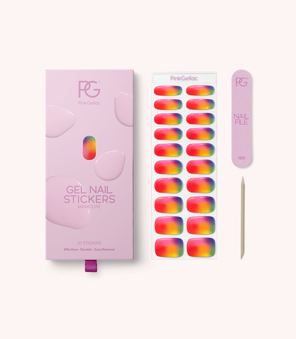 Let it flow, let it glow! Rainbow Flow is a colourful explosion on your nails - the Pride Gel Nail Stickers that are guaranteed to get you noticed. The flowing rainbow effect gently blends together, as if each colour is in motion. Bold, cheerful and full of pride!