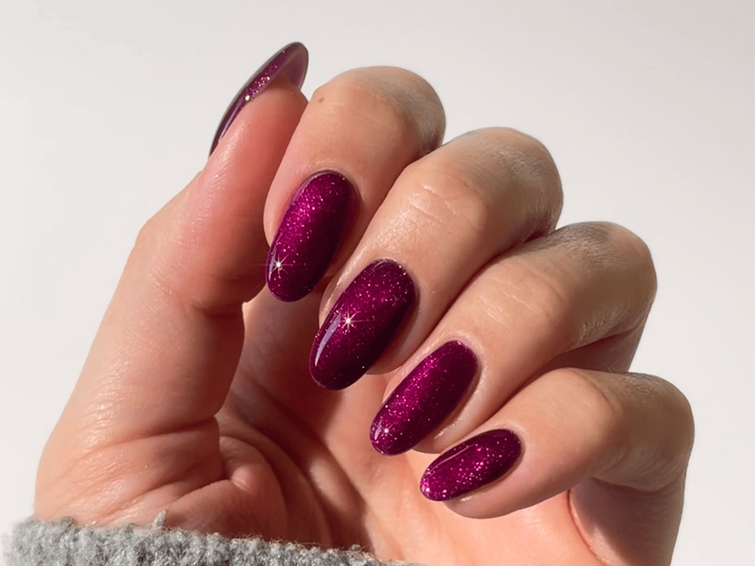 Ce look mise sur un jeu de superpositions. La base Cat Eye dynamique est créée avec Starlit Silver, puis une fine couche de 439 Berry Sheen est ajoutée pour plus de profondeur et d’intensité. Le résultat ? Une manucure multidimensionnelle qui oscille entre reflets scintillants et tons baie intenses – idéale pour un nail art festif et glamour.
