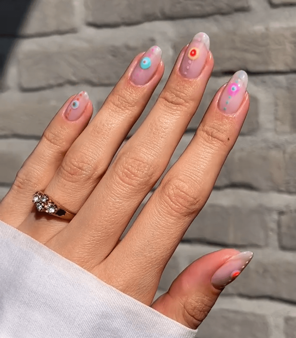 Neem nu een andere kleur en, met het kleinere uiteinde van ons stipgereedschap, maak een kleine stip in het midden van het ontwerp dat je tot nu toe hebt. Voeg ook drie stippen eronder en drie stippen erboven toe. Eenmaal tevreden met het resultaat, laat het ontwerp 60 seconden uitharden onder de LED-lamp.