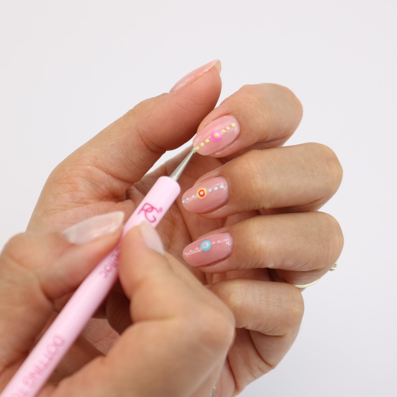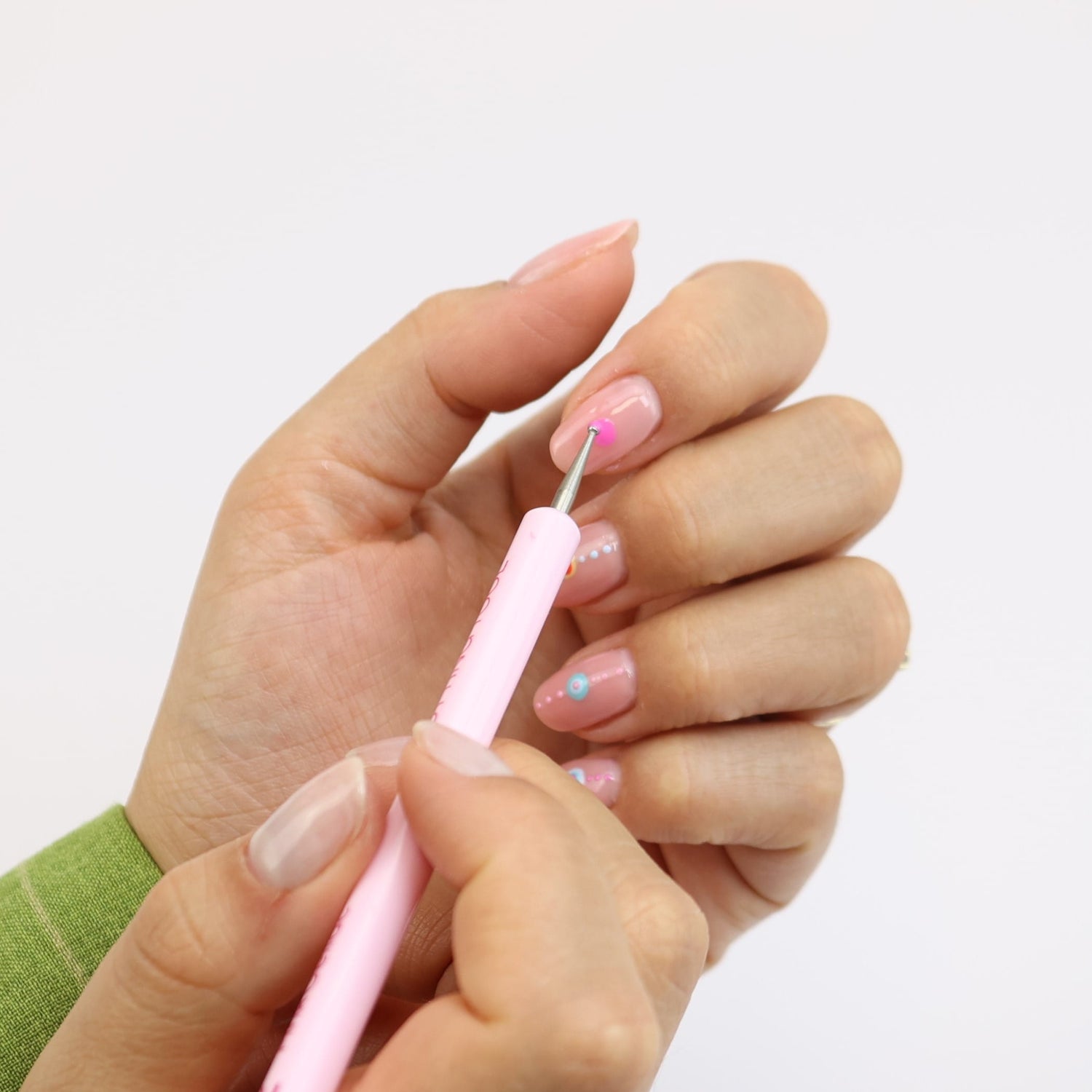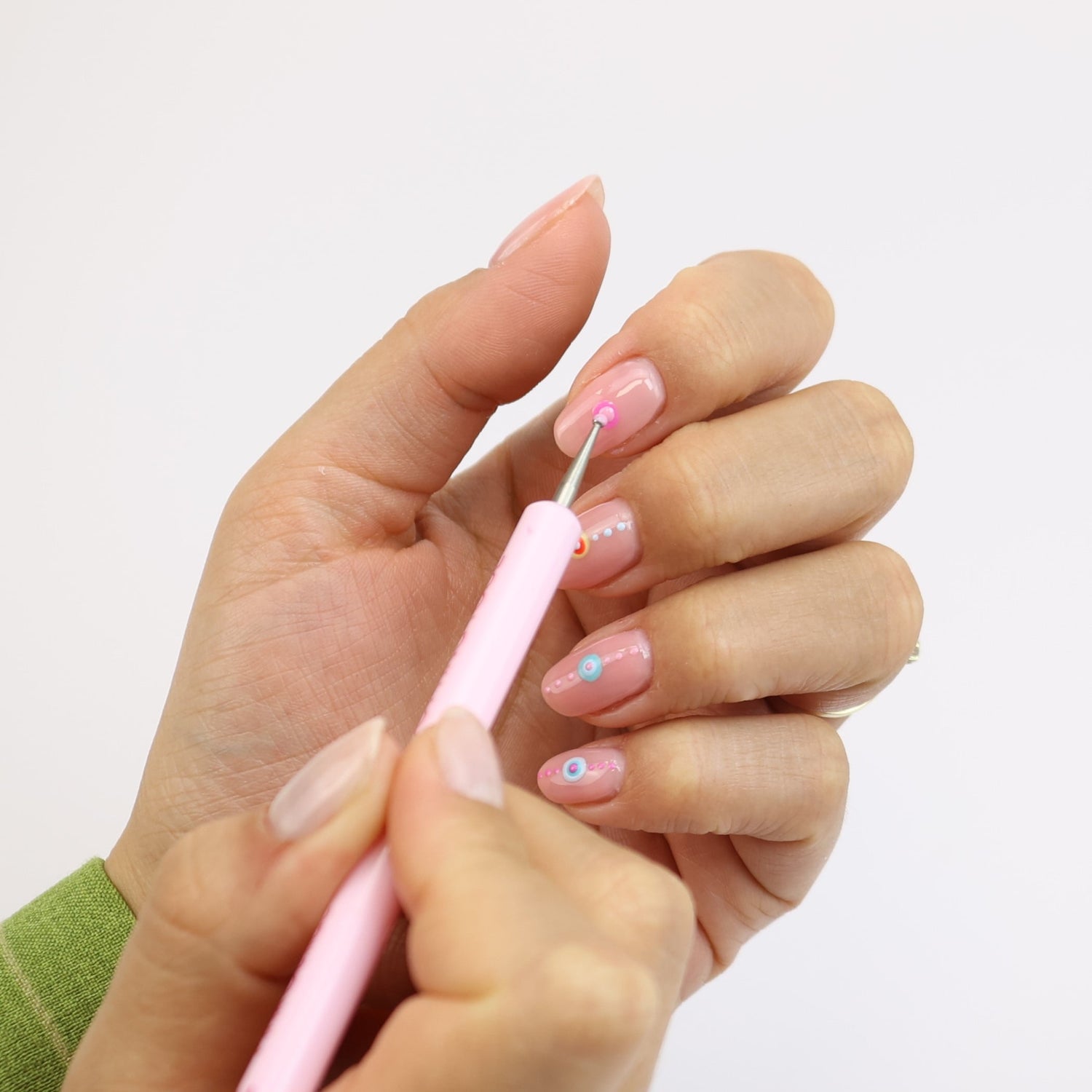 Creëer de grootste cirkel voor deze look met het grotere uiteinde van ons dubbelzijdige stipgereedschap. Gebruik het in een cirkelvormige beweging om de gewenste grootte te krijgen. Laat 30 seconden uitharden.